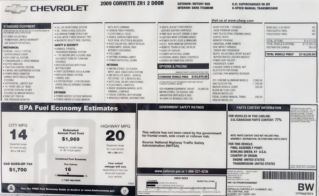 1YY87 CORVETTE ZR1 2 DOOR 103970.00 96692.10 INVOICE 04/28/09