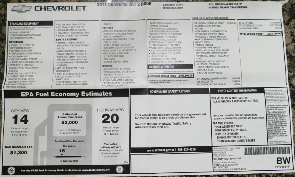 1YY87 CORVETTE ZR1 2 DOOR 109800.00 102663.00 INVOICE 04/25/11