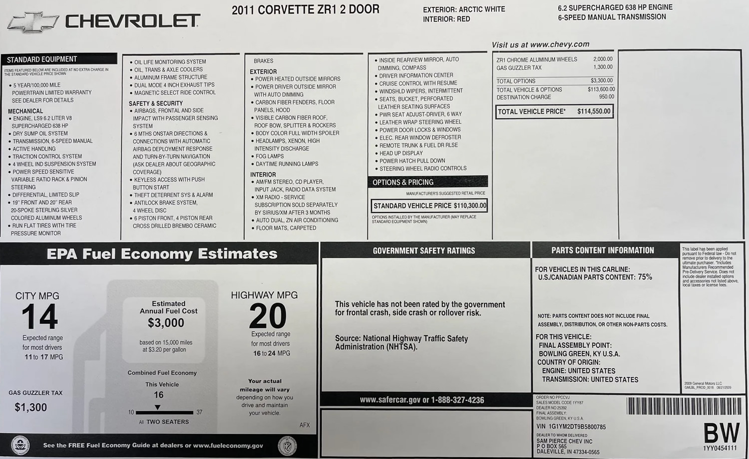 2011 Corvette ZR1 - Number 785 - Window Sticker