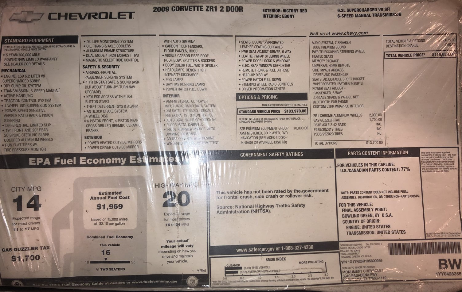 1YY87 CORVETTE ZR1 2 DOOR 103970.00 96692.10 INVOICE 05/21/09