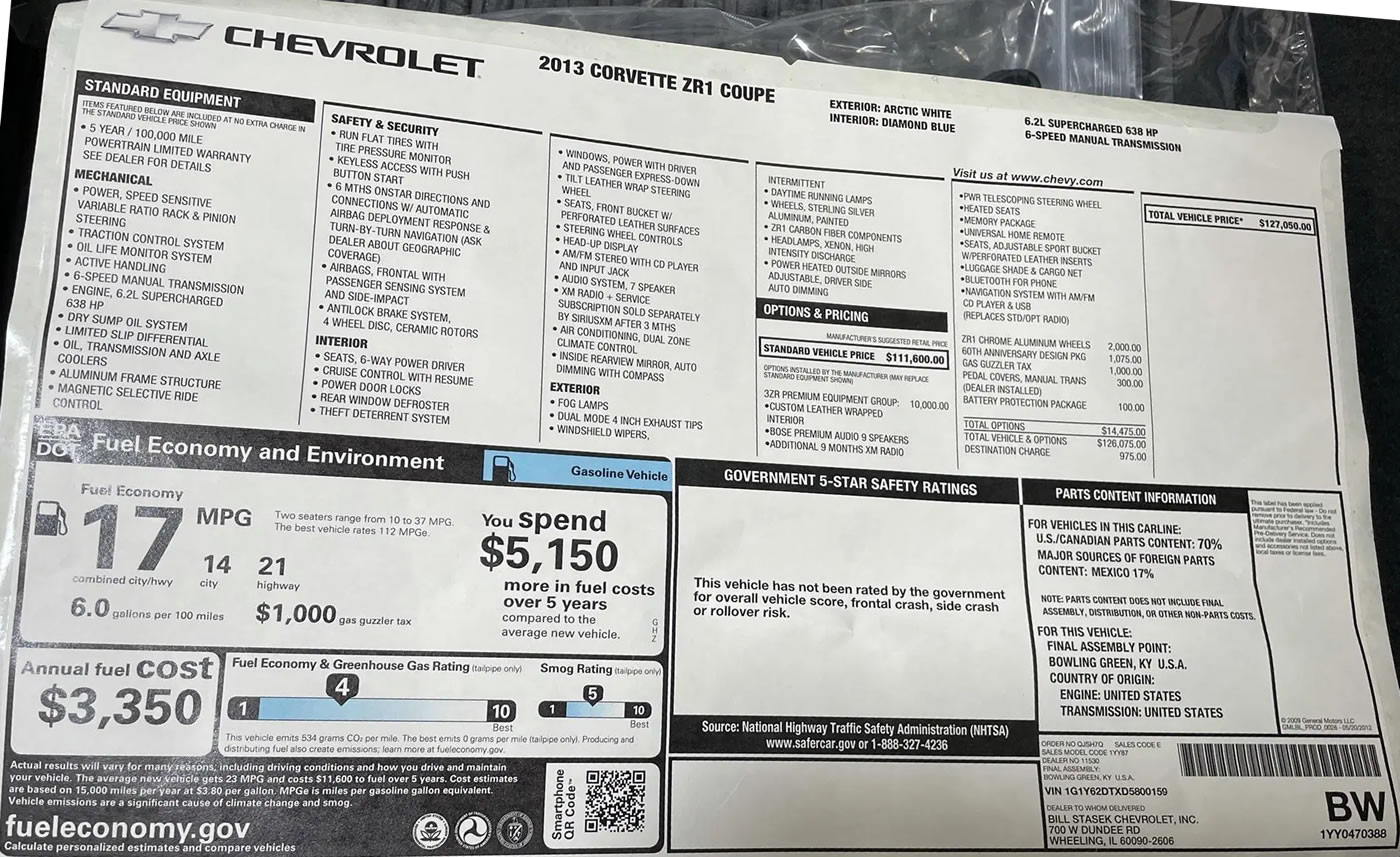 Below, are the production details and historical owner information for 2013 Corvette ZR1, Serial #159:
