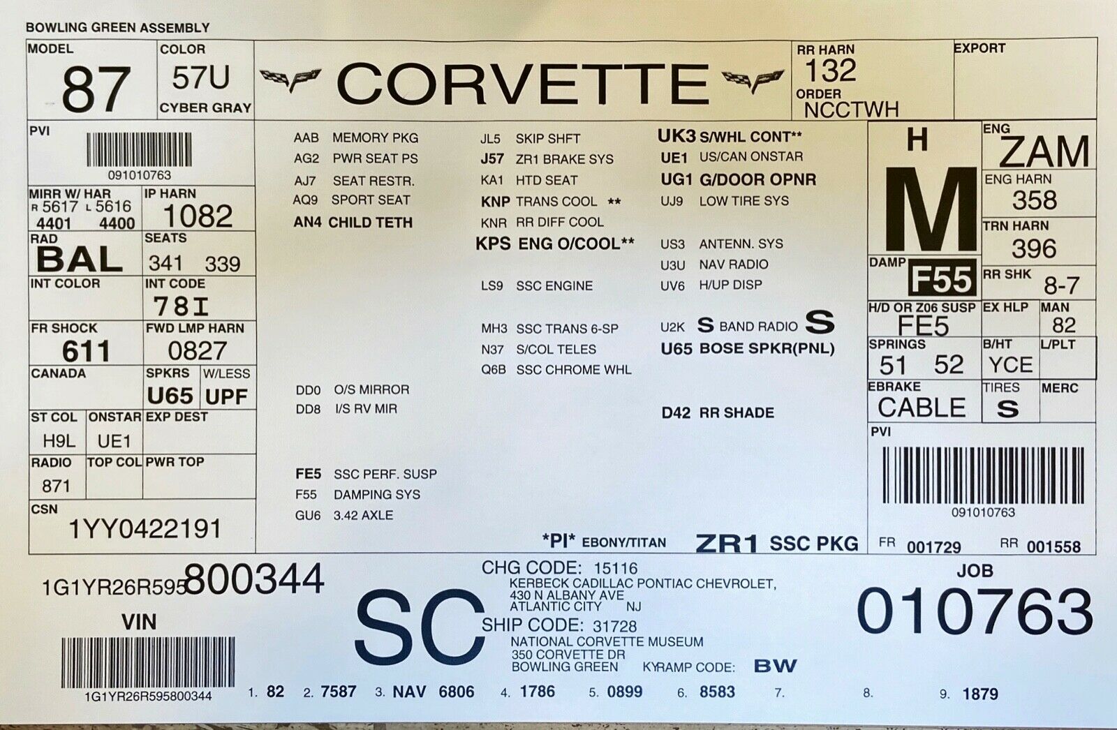 2009 Corvette ZR1 - Number 344 - Build Sheet