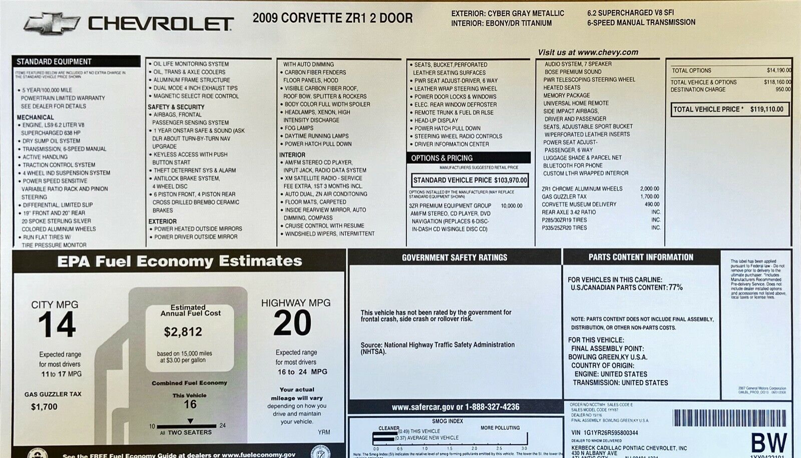 2009 Corvette ZR1 - Number 344 - Window Sticker