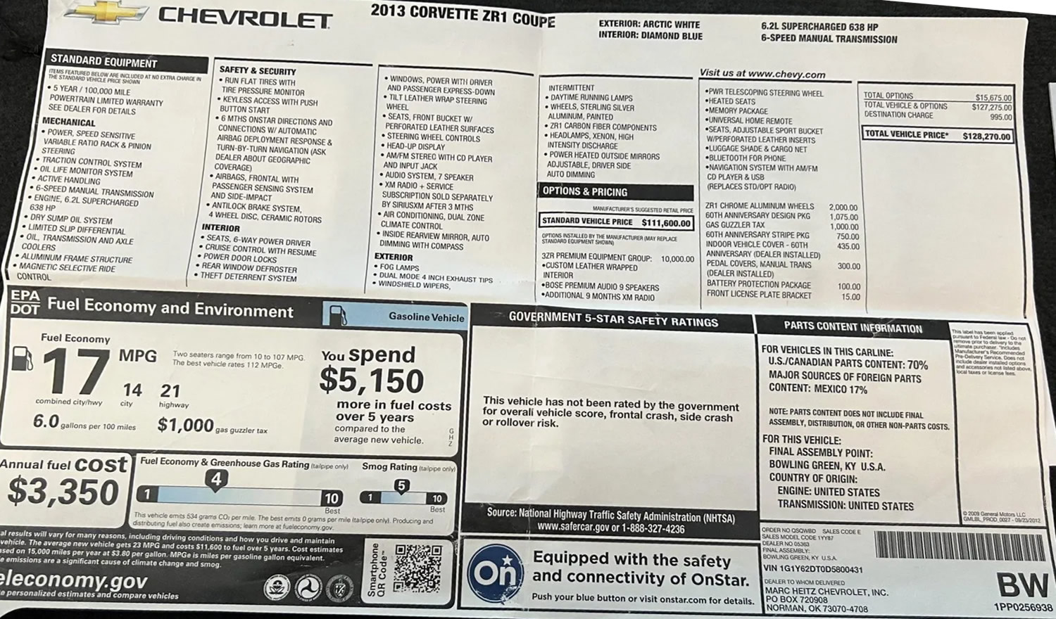 2013 Corvette ZR1 - Number 431 - Window Sticker