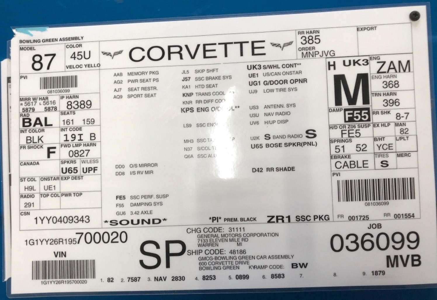 2009 Corvette ZR1 - Pre-Production Number 20 - Build Sheet
