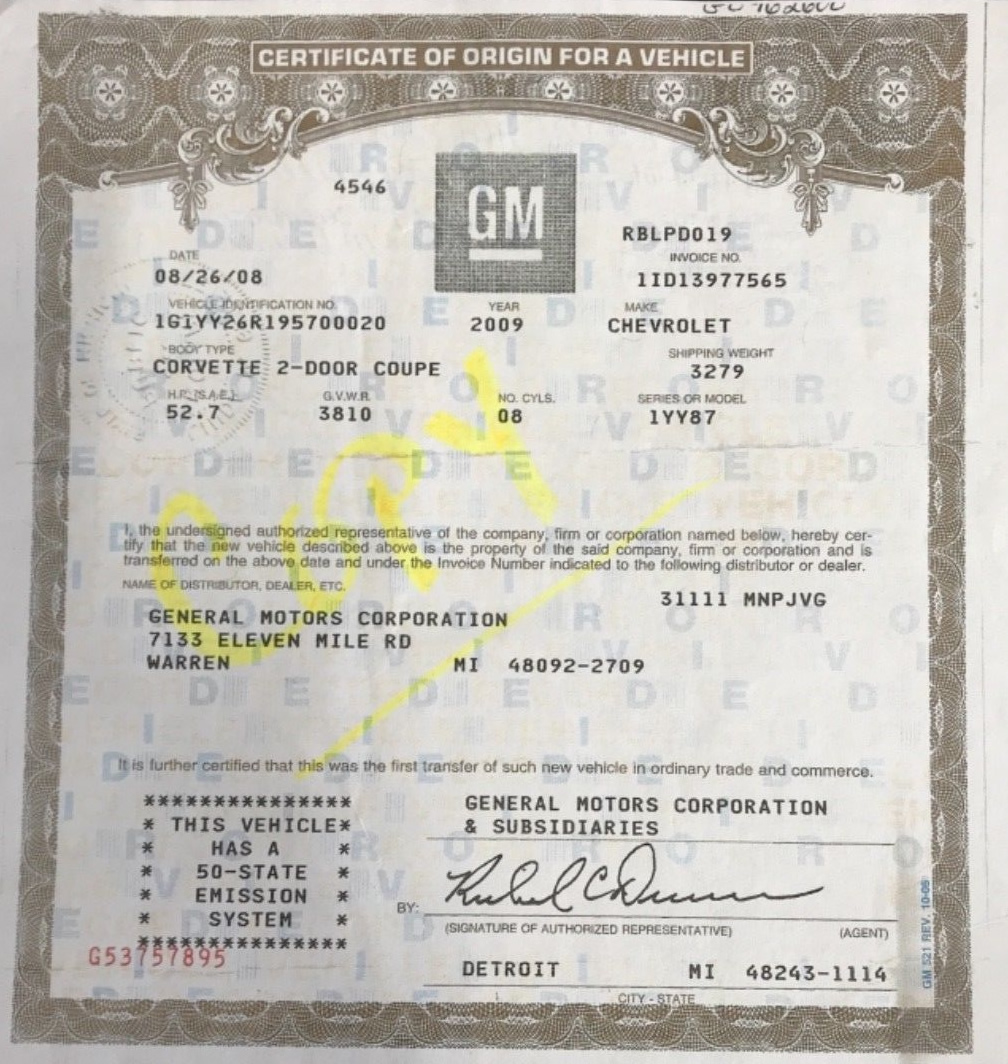 2009 Corvette ZR1 - Pre-Production Number 20 - Certificate of Origin