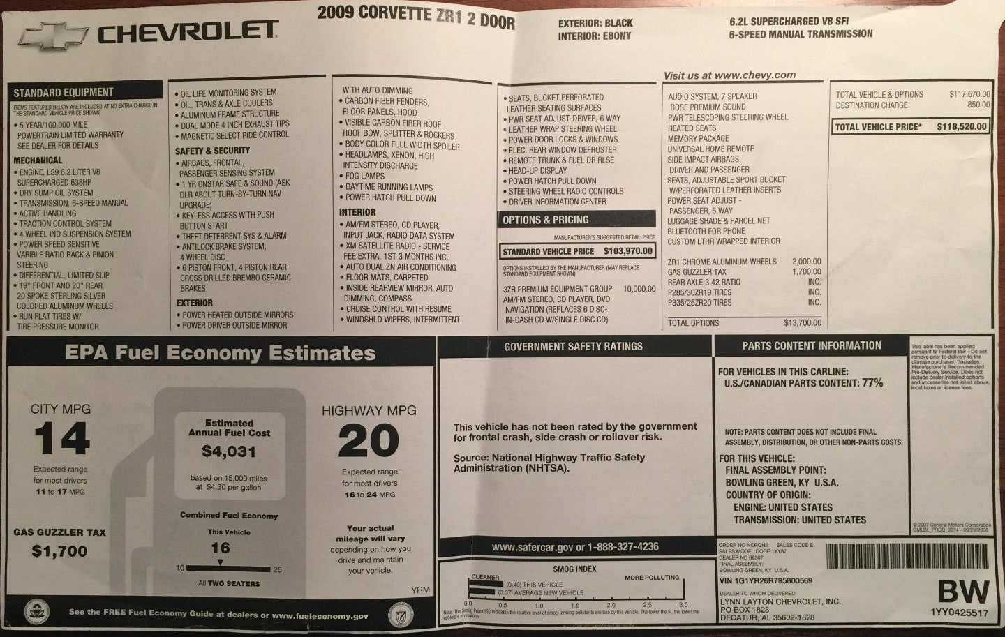 2009 Corvette ZR1 - Number 569 Window Sticker