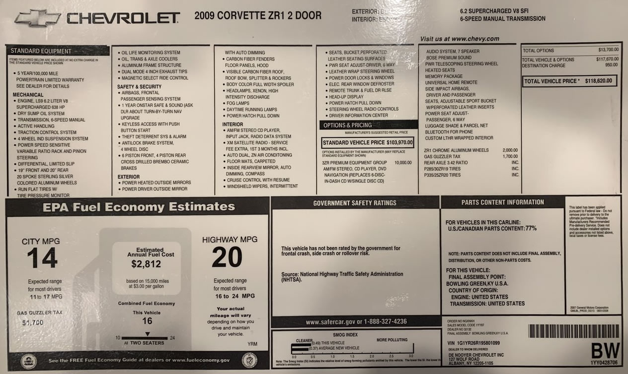 1YY87 CORVETTE ZR1 2 DOOR 103970.00 96692.10 INVOICE 05/26/09