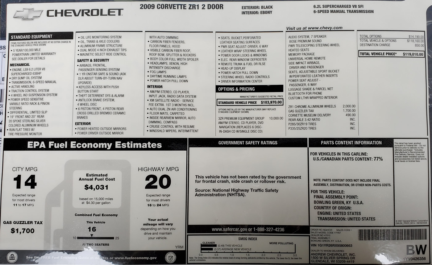 2009 Corvette ZR1 - Number 663 - Window Sticker