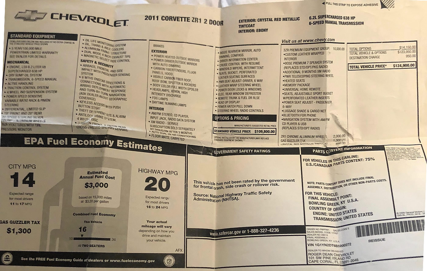 1YY87 CORVETTE ZR1 2 DOOR 109800.00 102663.00 INVOICE 08/03/10