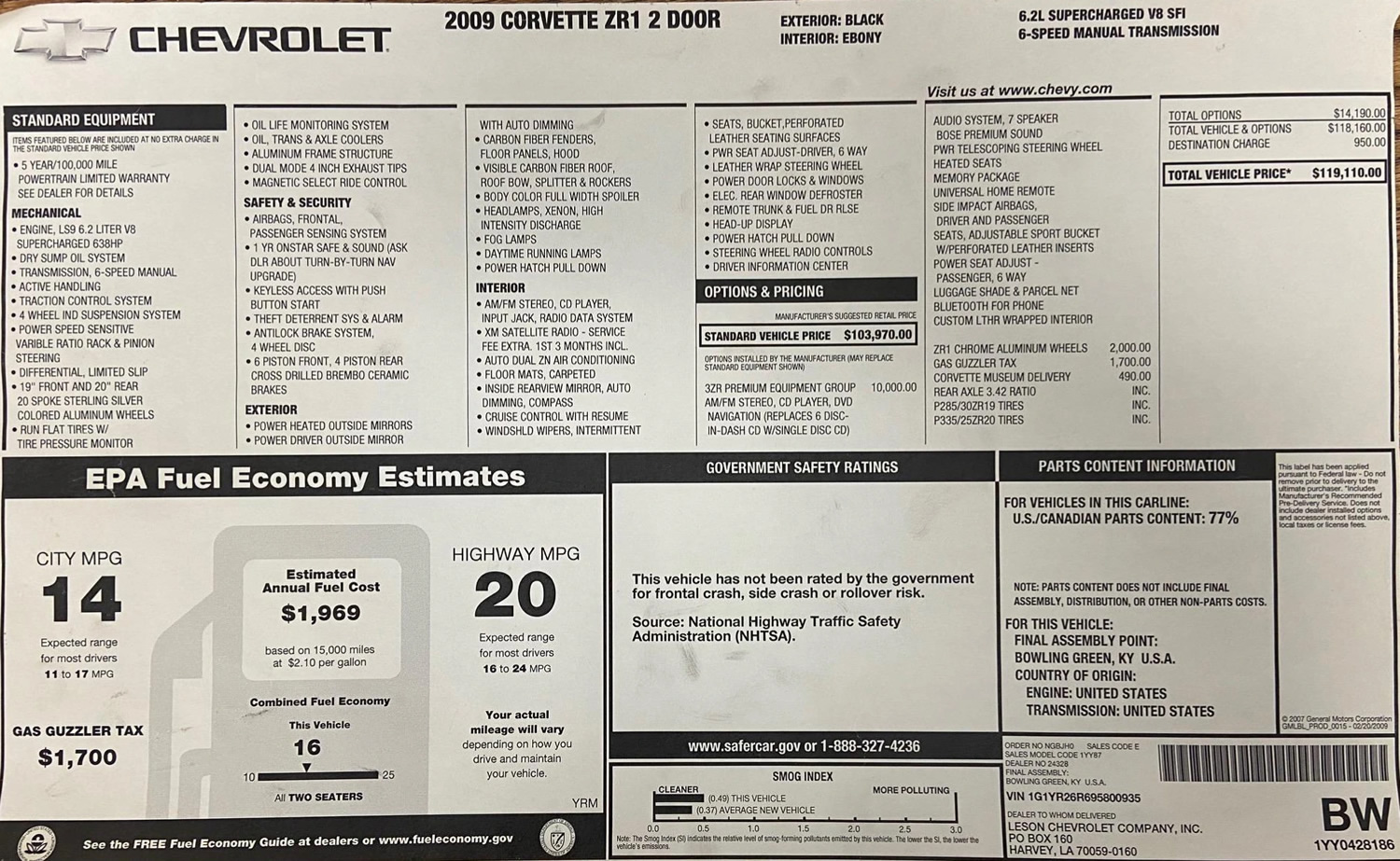 | Q6B - ZR1 CHROME ALUMINUM WHEELS | R8C - CORVETTE MUSEUM DELIVERY |