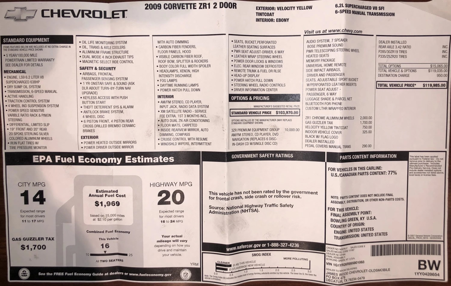 2009 Corvette ZR1 - Number 1083 - Window Sticker