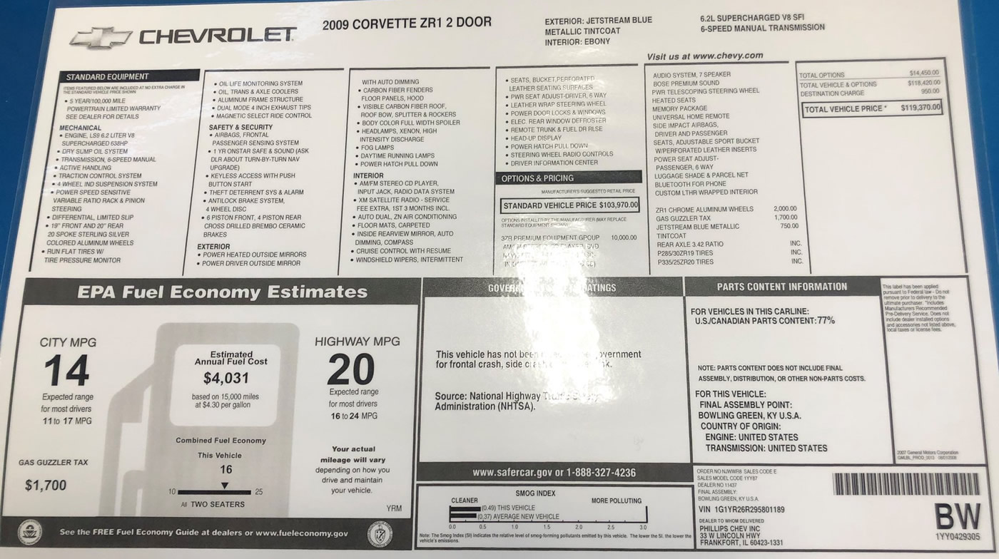 Below, are the production details and historical owner information for 2009 Corvette ZR1, Serial #1189: