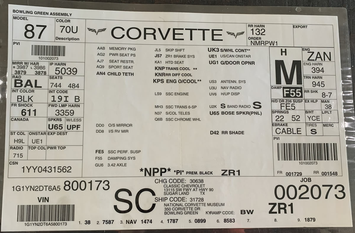 Below, are the production details and historical owner information for 2010 Corvette ZR1, Serial #173: