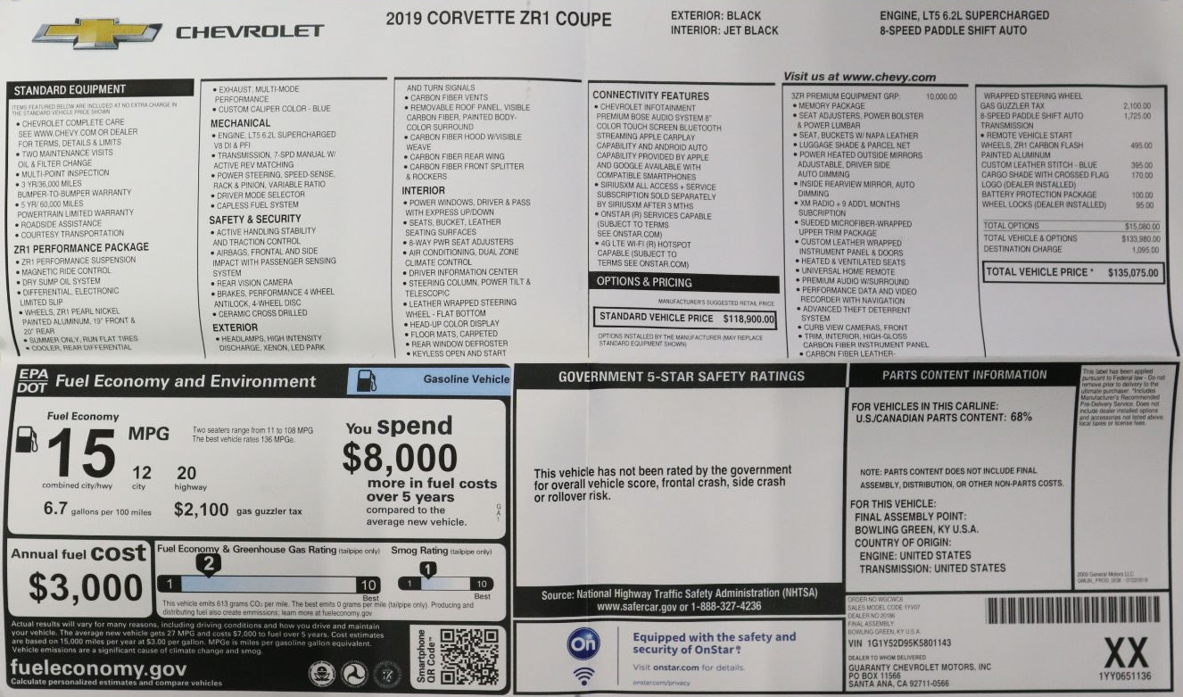 2019 CORVETTE ZR1 COUPE GENERAL MOTORS LLC