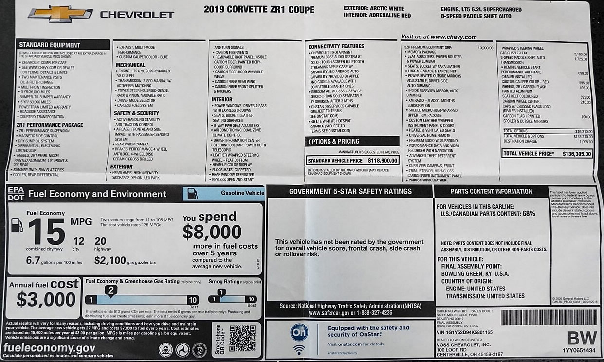 1YV07 CORVETTE ZR1 COUPE 118900.00 110814.80 INVOICE 10/15/18
