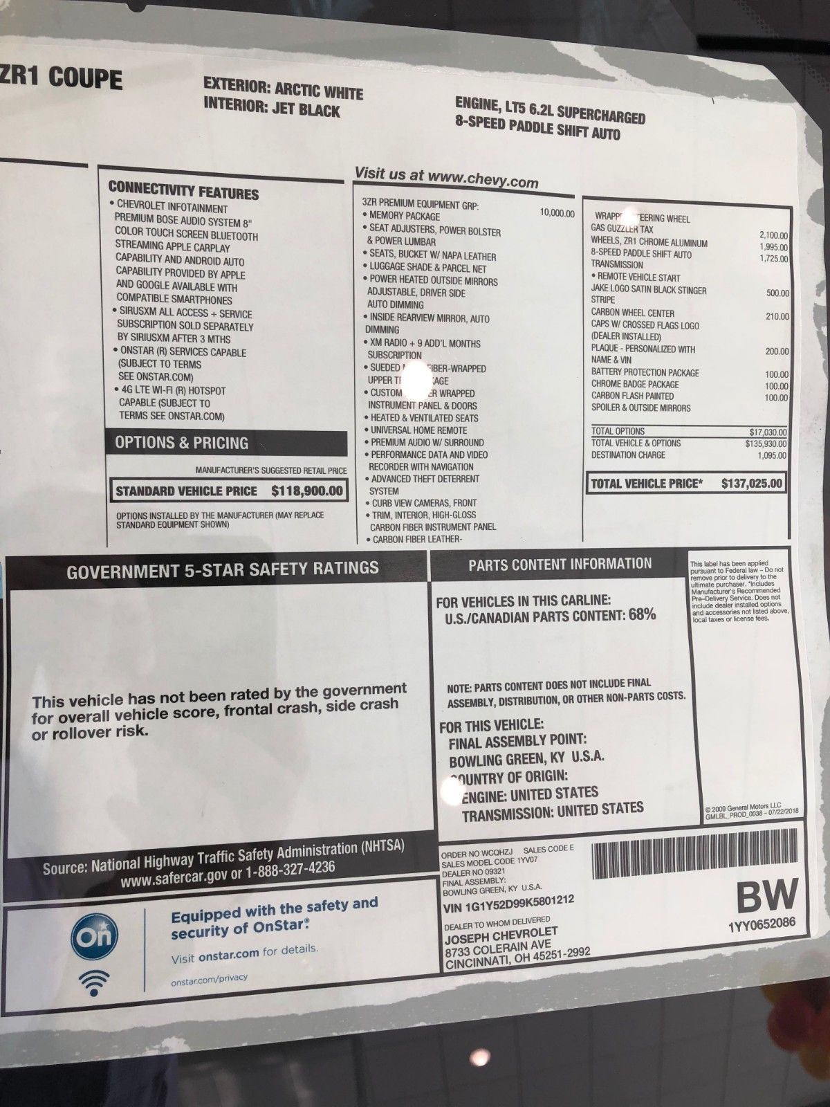 Below, are the production details and historical owner information for 2019 Corvette ZR1 Coupe, Serial #1212: