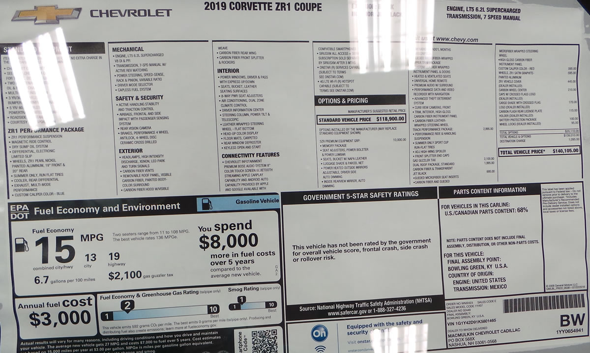 1YV07 CORVETTE ZR1 COUPE 118900.00 110814.80 INVOICE 12/14/18