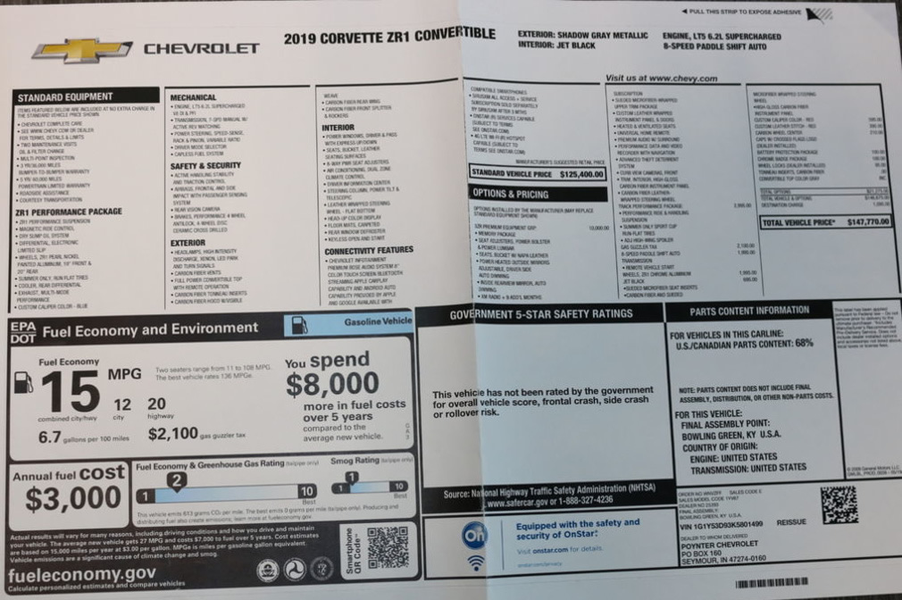 1YV67 CORVETTE ZR1 CONVERTIBLE 125400.00 116872.80 INVOICE 12/20/18