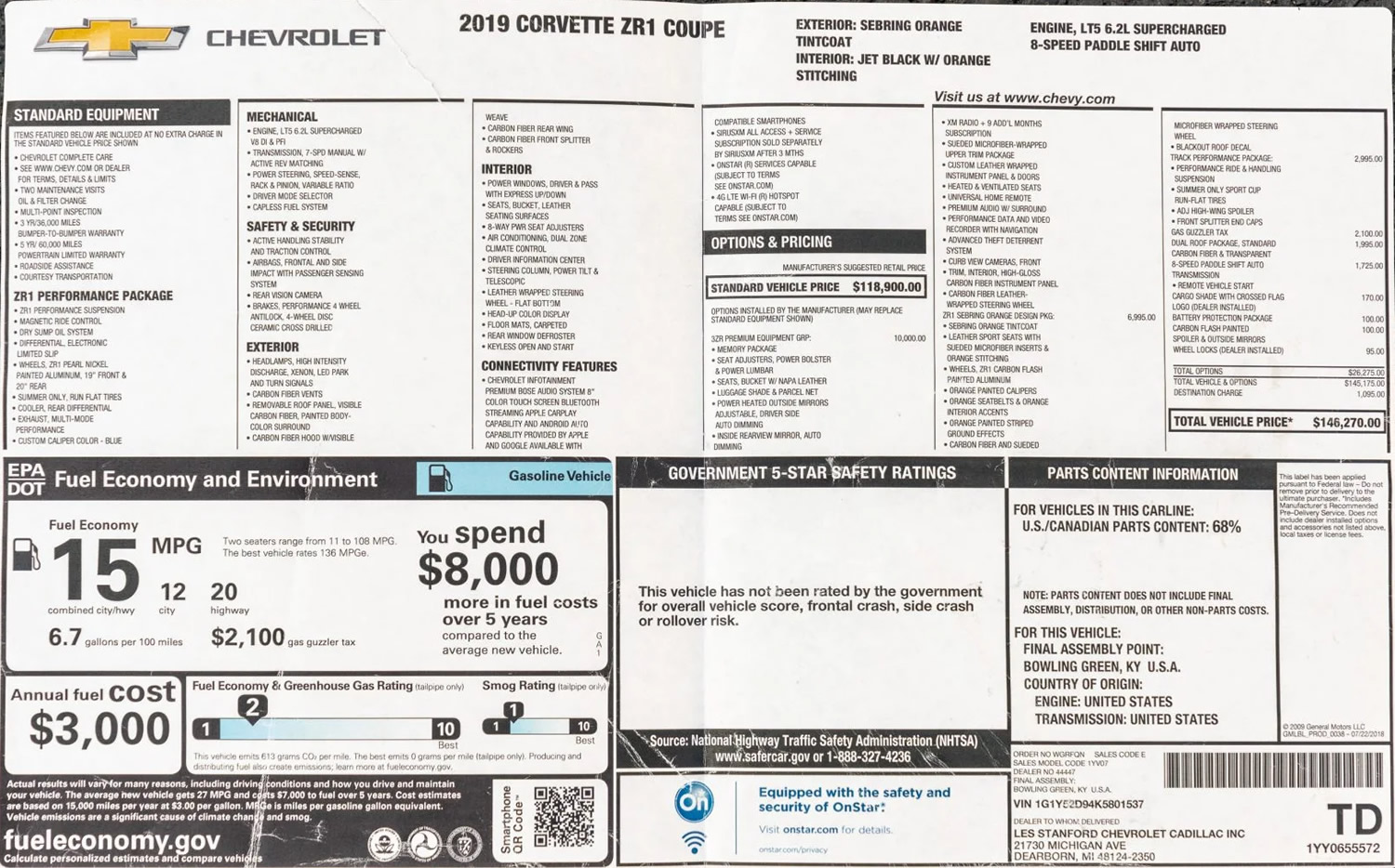 | ZLZ - ZR1 SEBRING ORANGE DESIGN PKG: * SEBRING ORANGE TINTCOAT * LEATHER SPORT SEATS WITH SUEDED MICROFIBER INSERTS & ORANGE STITCHING * WHEELS, ZR1 CARBON FLASH PAINTED ALUMINUM * ORANGE PAINTED CALIPERS * ORANGE SEATBELTS & ORANGE INTERIOR ACCENTS * ORANGE PAINTED STRIPED GROUND EFFECTS * CARBON FIBER AND SUEDED MICROFIBER WRAPPED STEERING WHEEL * BLACKOUT ROOF DECAL | ZR1 - PERFORMANCE PACKAGE SPECIAL COUPE |