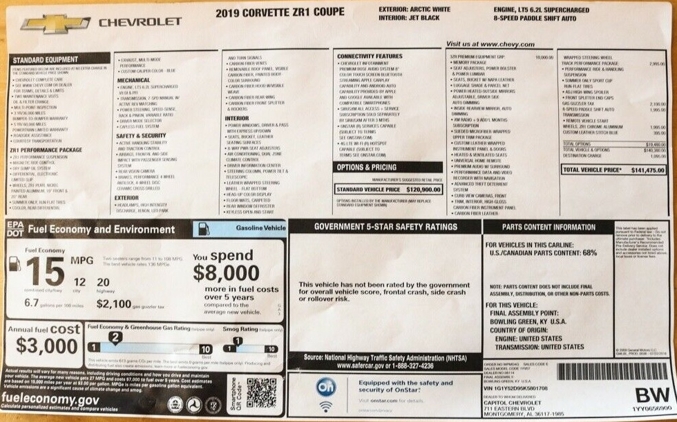 1YV07 CORVETTE ZR1 COUPE 120900.00 112678.80 INVOICE 01/28/19