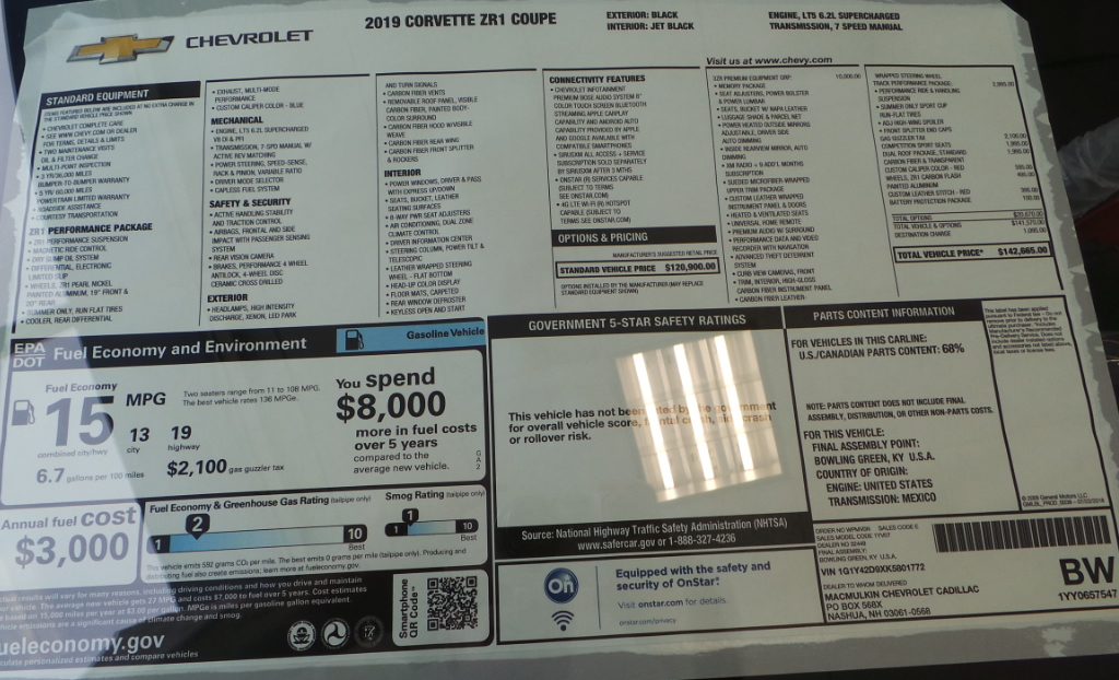 1YV07 CORVETTE ZR1 COUPE 120900.00 112678.80 INVOICE 02/06/19