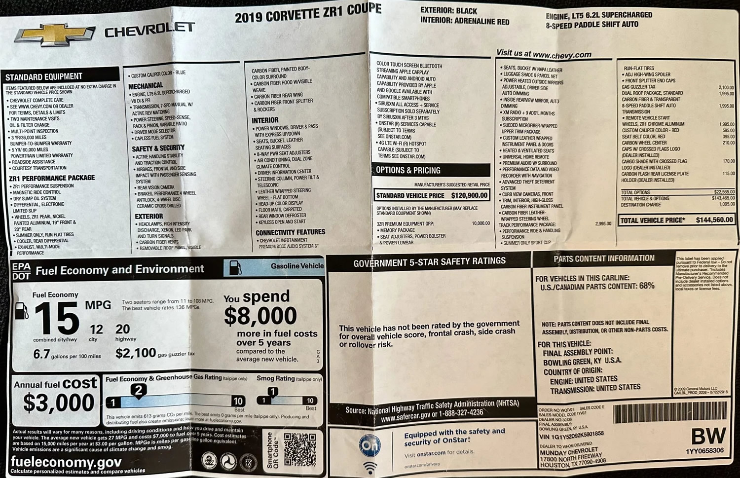 Below, are the production details and historical owner information for 2019 Corvette ZR1 Coupe, Serial #1858: