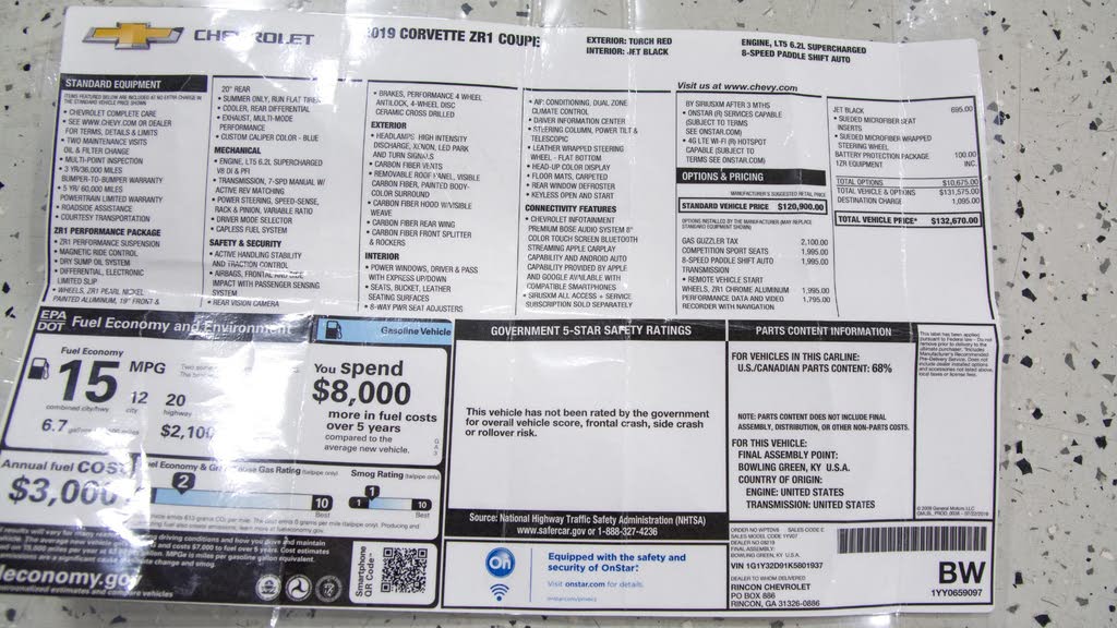 1YV07 CORVETTE ZR1 COUPE 120900.00 112678.80 INVOICE 03/04/19