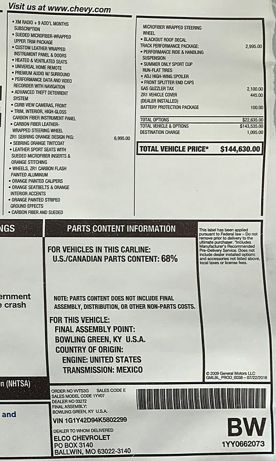 | Z52 - DRY SUMP OIL SYSTEM | ZLZ - ZR1 SEBRING ORANGE DESIGN PKG: * SEBRING ORANGE TINTCOAT * LEATHER SPORT SEATS WITH SUEDED MICROFIBER INSERTS & ORANGE STITCHING * WHEELS, ZR1 CARBON FLASH PAINTED ALUMINUM * ORANGE PAINTED CALIPERS * ORANGE SEATBELTS & ORANGE INTERIOR ACCENTS * ORANGE PAINTED STRIPED GROUND EFFECTS * CARBON FIBER AND SUEDED MICROFIBER WRAPPED STEERING WHEEL * BLACKOUT ROOF DECAL |