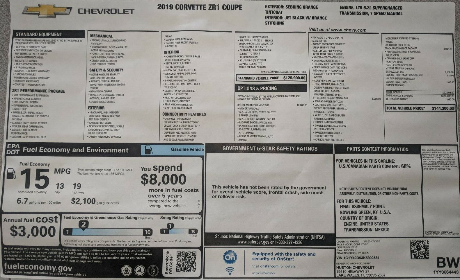 | ZLZ - ZR1 SEBRING ORANGE DESIGN PKG: * SEBRING ORANGE TINTCOAT * LEATHER SPORT SEATS WITH SUEDED MICROFIBER INSERTS & ORANGE STITCHING * WHEELS, ZR1 CARBON FLASH PAINTED ALUMINUM * ORANGE PAINTED CALIPERS * ORANGE SEATBELTS & ORANGE INTERIOR ACCENTS * ORANGE PAINTED STRIPED GROUND EFFECTS * CARBON FIBER AND SUEDED MICROFIBER WRAPPED STEERING WHEEL * BLACKOUT ROOF DECAL | ZR1 - PERFORMANCE PACKAGE SPECIAL COUPE |