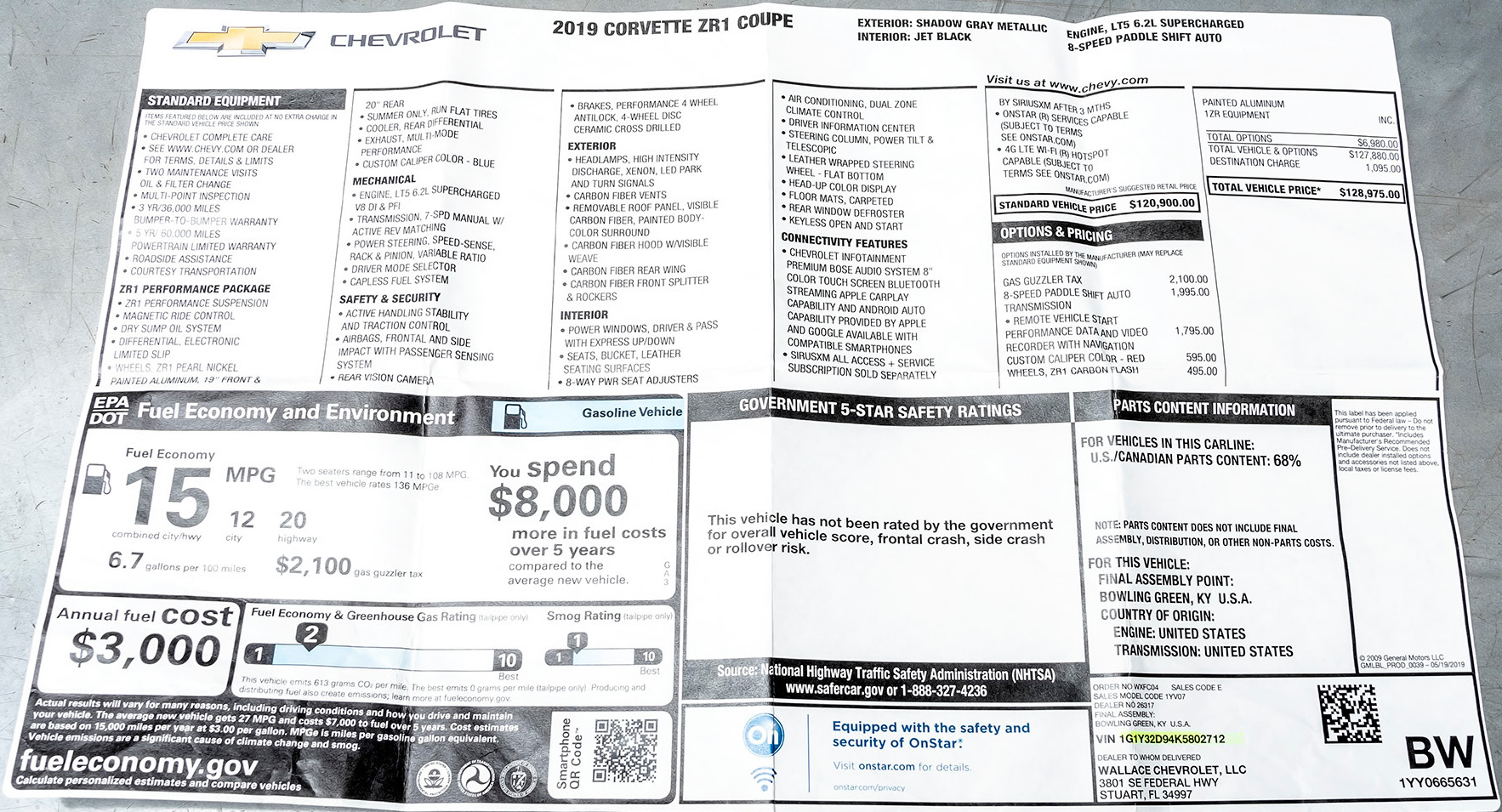 2019 CORVETTE ZR1 COUPE GENERAL MOTORS LLC