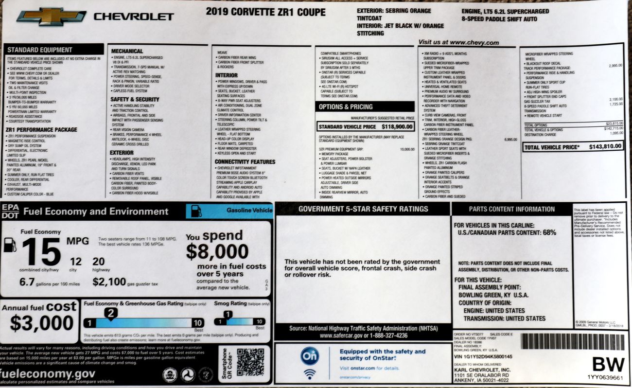 | Z52 - DRY SUMP OIL SYSTEM | ZLZ - ZR1 SEBRING ORANGE DESIGN PKG: * SEBRING ORANGE TINTCOAT * LEATHER SPORT SEATS WITH SUEDED MICROFIBER INSERTS & ORANGE STITCHING * WHEELS, ZR1 CARBON FLASH PAINTED ALUMINUM * ORANGE PAINTED CALIPERS * ORANGE SEATBELTS & ORANGE INTERIOR ACCENTS * ORANGE PAINTED STRIPED GROUND EFFECTS * CARBON FIBER AND SUEDED MICROFIBER WRAPPED STEERING WHEEL * BLACKOUT ROOF DECAL |