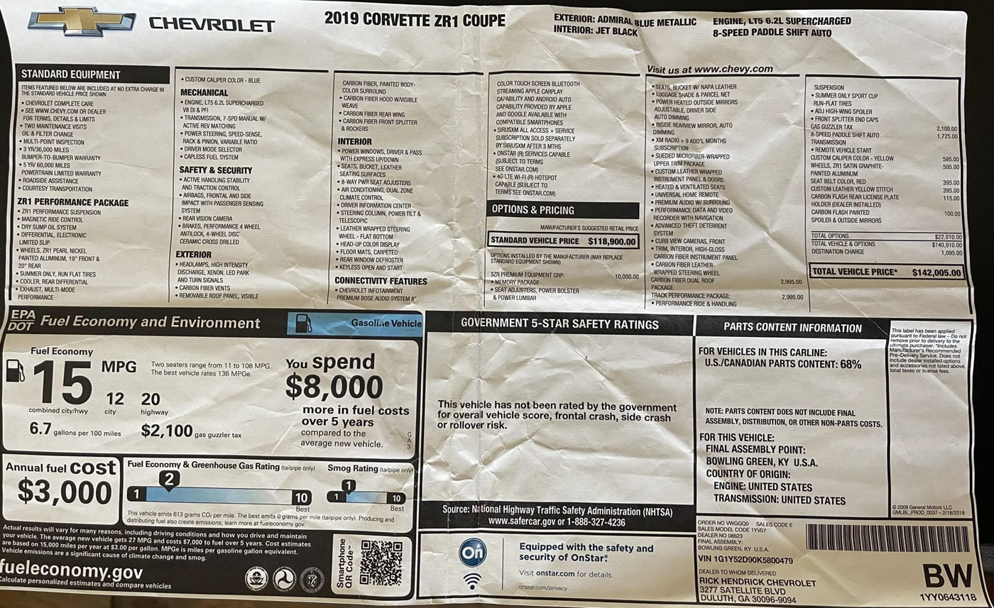 Below, are the production details and historical owner information for 2019 Corvette ZR1 Coupe, Serial #479: