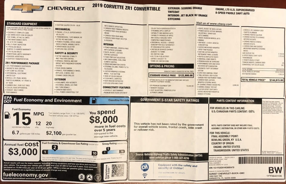 ZLZ ZR1 SEBRING ORANGE DESIGN PKG: 6995.00 6365.45