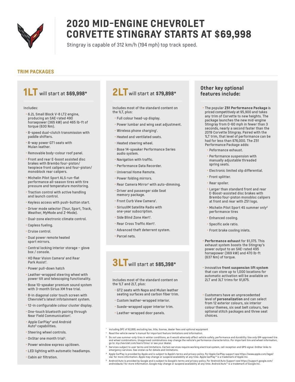 The 1LT will start at $69,998, the 2LT trim package will start at $79,898 and the top-level 3LT trim package on the 2020 Corvette Stingray will start at $85,398 (including DFC, excluding tax, title, license, dealer fees and optional equipment). Specific details on each trim level are covered in the attached graphic.