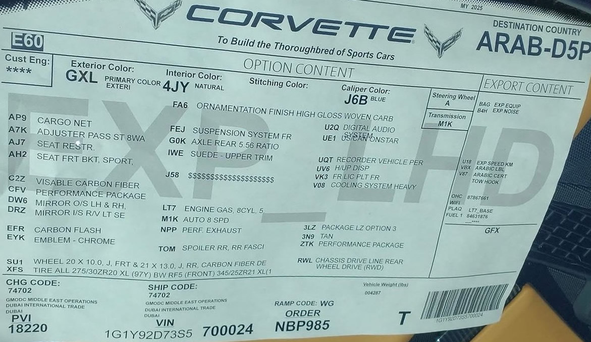 2025 Corvette ZR1 Captured Test Fleet - S5700024 - Build Sheet