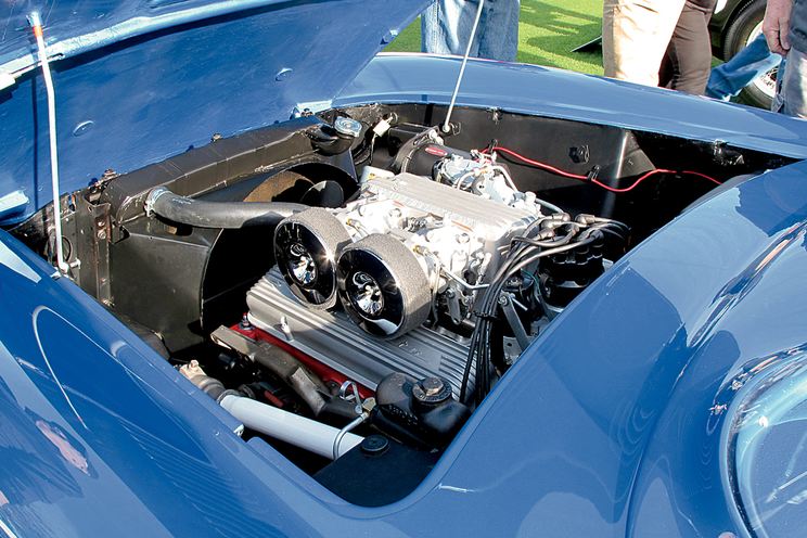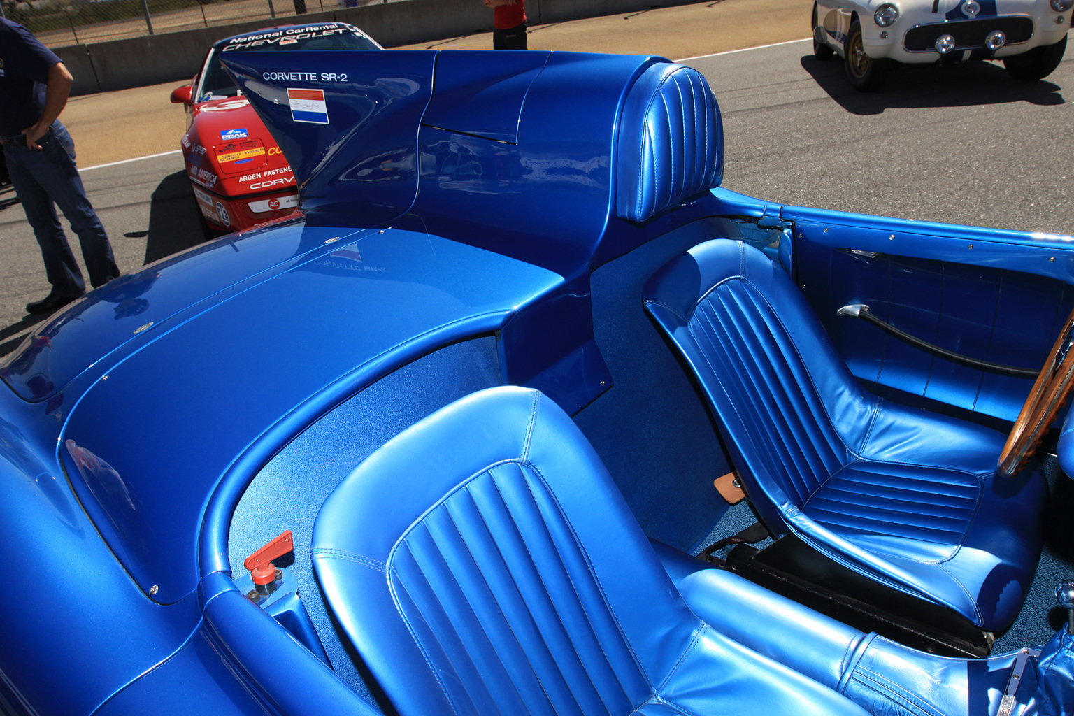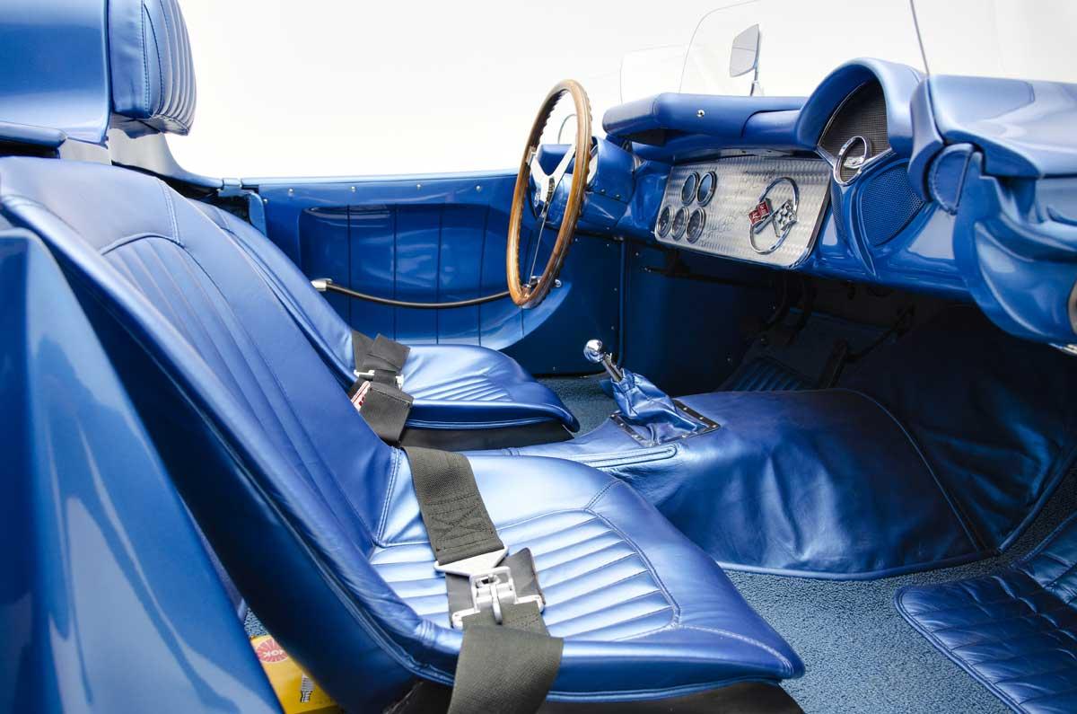 Jerry Earl continued to race it in the Central Region SCCA throughout 1956 and 57. Over the winter, the new special 331 cubic inch fuel injection engine was installed along with an all new 1957 four speed transmission. The larger fin was also installed at this time with special gas tank filler cap. The weight was reduced by removing the stock interior, including door panels to light fiberglass concave panels. Lightweight seats from a Porsche were added. The weight reduction program brought the weight down by 300 pounds. This is the configuration of the SR-2 as it stands today.