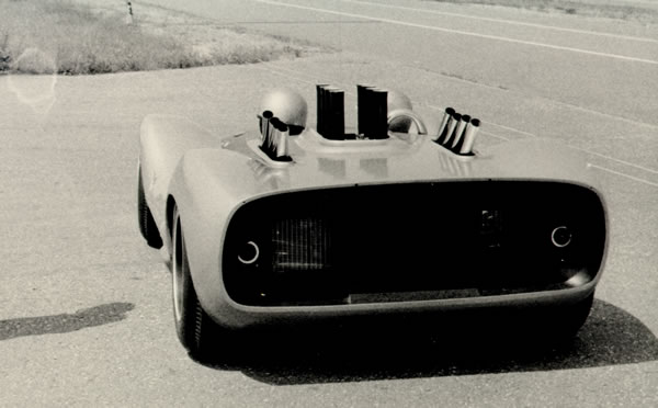 Unbeknownst to me, Jim Hall had already talked with Bob McLean and one of his engineers, Ed Heinzman. These were the people who originally had the idea of using the inverted air foil idea to generate downforce. For the Chaparral II (a) the concept included the high nose and the heavily cambered sides. This was the same idea that we had incorporated into the 1963, together with the high belt line and wheel bumps that Mitchell wanted. It hadn't really worked with the '63 or with the original Grand Sports. For the '63 model they had tried the grilles on top of the hood to vent air and reduce lift but that idea didn't really work very well either. To counteract the lift, Jim Hall's group had added a very large front spoiler. That design had proved good enough to win at Riverside but with the same size tires front and rear the whole car really didn't work as well as it might have.