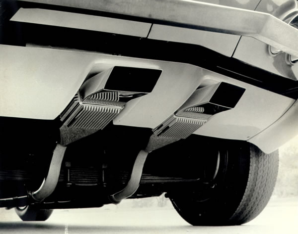 Mako Shark I, as shown at the New York show in January 1965 was a non-running model with the outside side pipes rising up into the front fenders. Mako Shark II, first shown at the Paris Auto Salon in October of the same year, was now a running model with more conventional rear-exiting exhaust system. The exposed ends of the exhaust were quite highly styled in a boxed and finned arrangement much like I had done for the SS Racer.