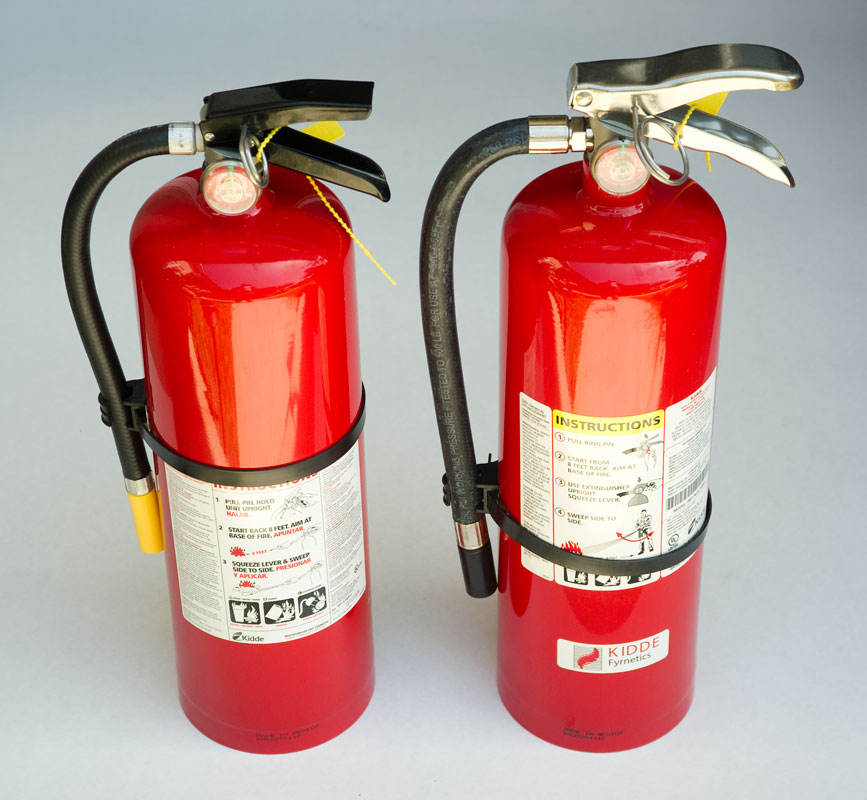 Portable extinguishers are often the “stored pressure” type, meaning they are filled with a fire suppression or extinguishing agent and then pressurized, usually with either nitrogen gas, CO2 or air. They are metal cylinders, either steel or aluminum, topped with a handle and a lever. When you push the lever down by squeezing it and the handle together, a valve opens. The gas pressure is released and forces the extinguishing agent out of the cylinder, through the valve and out through (small extinguishers) a nozzle or (larger extinguishers) a short hose with a nozzle at the end. A pressure gauge mounted on the handle assembly tells the user if the extinguisher is fully charged. A ring pin locks the lever and handle and must be removed or “pulled” before the extinguisher can be used.
