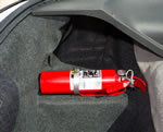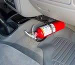 A fire extinguisher needs to be mounted securely and safely in the vehicle. Many units designed for carrying in a car come with some type of mounting bracket or cradle. If your extinguisher does come with a mount, we strongly suggest using it because the unit's maker has designed the mount specifically for that extinguisher. Locate the extinguisher in a place were it can be easily reached, but does not pose a hazard in a collision. One place you absolutely do not want to mount a fire extinguisher is on the windshield post inside the car. In a frontal impact your head or your passenger's head could hit the fire extinguisher resulting in severe head injury or death.