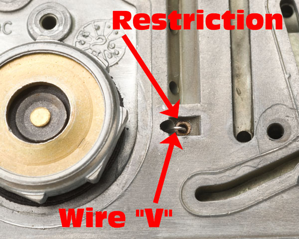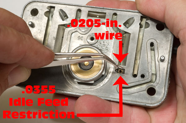 Now, get the primary idle transfer mixture in the ball park. With Double-Pumpers on engines having modest duration/high lift roller cams typical of hot street duty cycles, it will be too rich. Fuel is metered to the idle screws and the idle transfer ports by "idle feed restrictions" (IFR), little tiny jets inside the metering block which are not removable. You can't make IFRs smaller, so the DIY fix is to restrict them with small wire "V"s. You'll need either a good set of dial calipers or a 0-1-inch vernier micrometer to measure their diameters.