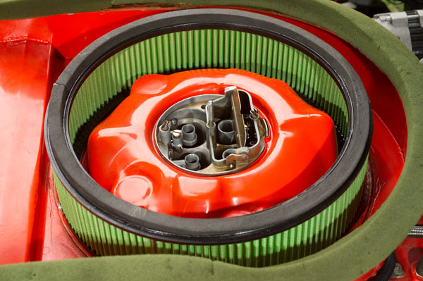 Starting at about 6200 the air-fuel went rich. Such behavior can indicate an air flow restriction. For many years I've run an air box around the carb, a three-inch high Green Filter and a stock air cleaner top. A four-inch filter won't fit, so Green folks were kind enough to make a couple of 3.5-inch high filters which I could use if I pitched the air cleaner top and used sections of square foam to seal the filter to the bottom of the hood.