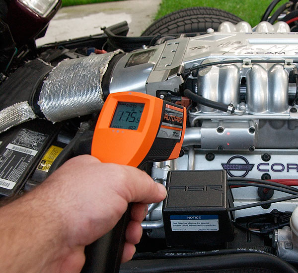 The Raytek brand (now owned by the Fluke people) began marketing "noncontact" infrared thermometers for automotive use in the mid-'90s. A Raytek is elegant in its simplicity. Pull the trigger, put the laser point on the object then read temperature on its display. Have an engine with a misfire? Read each exhaust port. If one is a lot cooler, there's your misfiring cylinder. Got an exhasut port that's a little hotter than the others? That cylinder might be lean. You can determine if a catalytic converter is working by measuring inlet and outlet temperatures. Have a Vette that doesn't cool well but the cooling system seems to check-out ok? With the engine running, aim the Raytek at different areas of the radiator. A partial blockage will be cooler than surrounding tubes. If the gauge shows hot but the engine isn't overheating. Measure the water outlet or the temperature sensor to verify gauge accuracy.