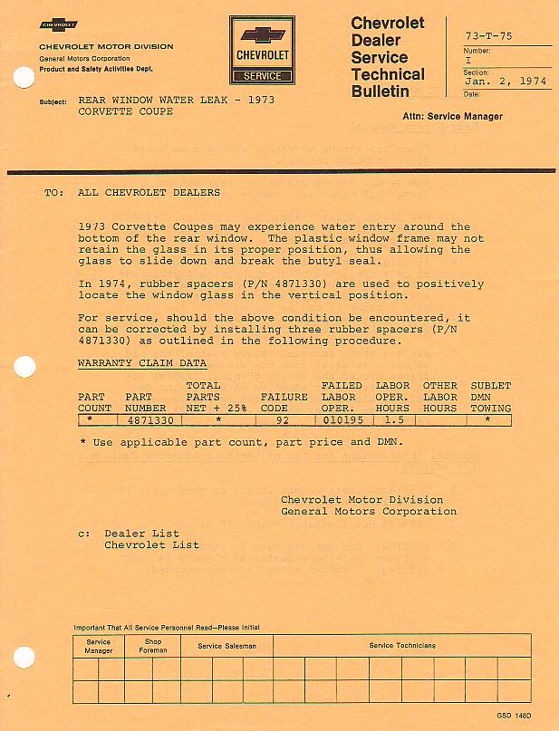 1973 Corvette: Service Bulletin: Rear Window Water Leak Estimated Reading Time: < 1 Minute 133 July 6, 2014 Body and Trim 0 1.91K Attached images are below.