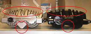 As you can see below, the major difference between the J55/GS and the JL9 caliper is the width of the throat where the rotor resides. The J55/GS caliper is the one on the left and is about .5" wider than the JL9.