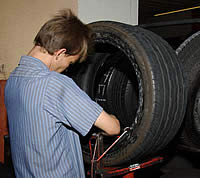 Back at the shop, after a 51.6-mi. test, Mike LoMonoco and I pulled the left rear and took it to Tucker Tire Service, a Goodyear Dealer in Covina, California, for repair. One of Tucker’s most experienced tire technicians, Frank Wright, dismounted the tire, patched it, remounted it and re-inflated it.