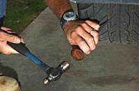 Ouch! Betcha haven’t seen many people do this. Making holes in EMT’s is best done with a sharp awl and a hammer. Trust me. Those tires are pretty tough. Image: Author |