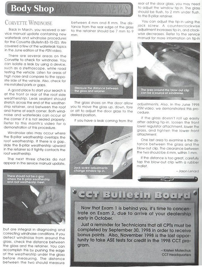 1997 - 2000 Corvette: Chevrolet Pro Service News: Corvette Windnoise Estimated Reading Time: < 1 Minute 36 July 2, 2014 Body and Trim 0 1.84K Source: Chevrolet Pro Service News Date: September 1998, Volume 7, Issue #9