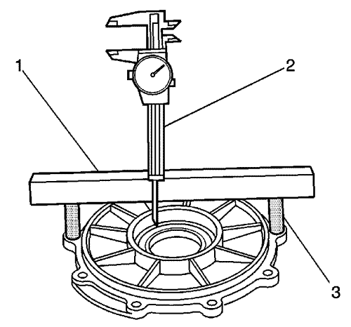 - Use a caliper (2), a straight edge (1), and J 42168-16 (3) in order to measure the NEW differential cover bore dimension. Record the measurement as value A.
